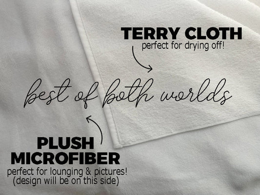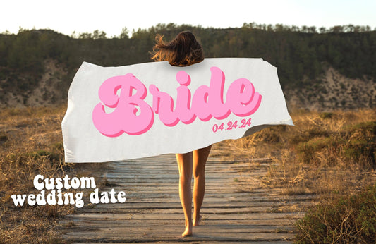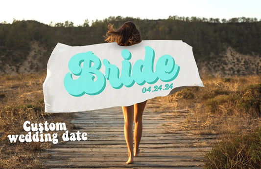 Custom Retro Bride and Bridesmaid Beach Towels With Wedding Date