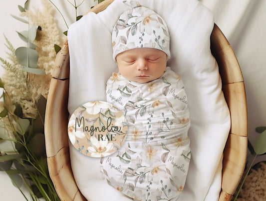 Magnolia Floral Baby Swaddle Magnolia Baby Blanket with Name Sign Gift Set