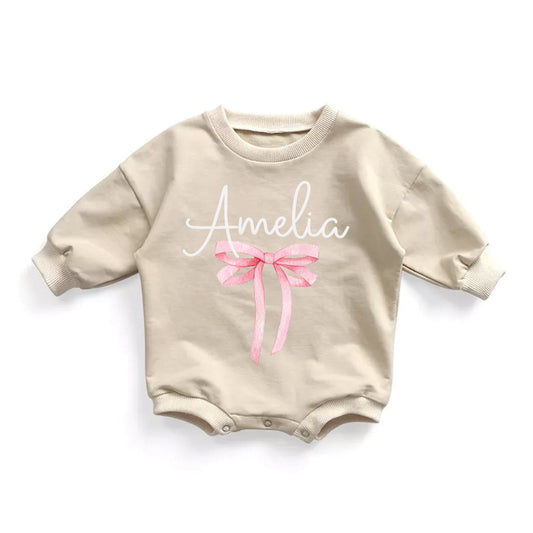 Girls Coquette Pink Bow Romper With Name Baby girl Coquette Outfit Girls Pink Satin Bow
