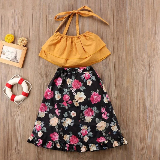 SALE Mustard Halter Crop Top w/ Floral Skirt
