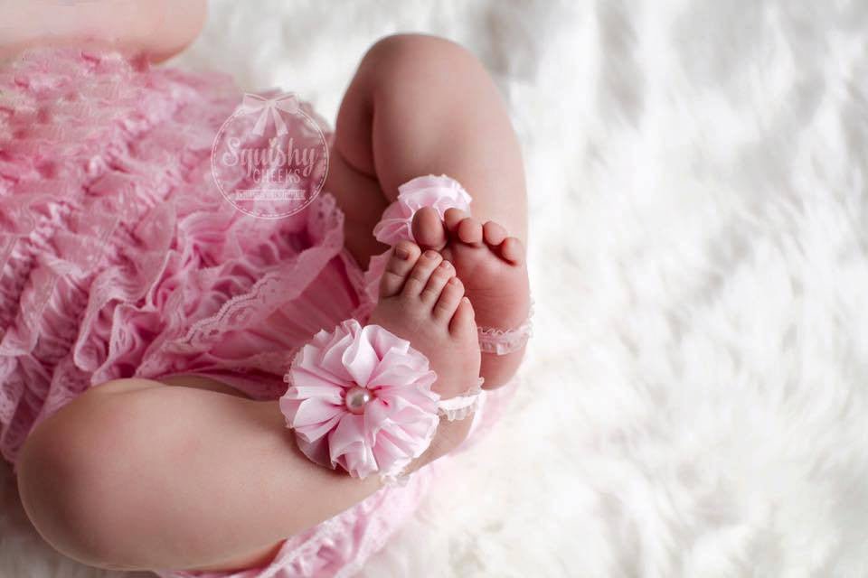These Light Pink Ruffled Barefoot Sandals are made from super soft, stretchy elastic attached to a poofy flower, adorned with a pearl. Our Piggy Petals are ADORABLE and you will get compliments where ever you go! These sandals are not constricting like shoes, so your baby won't mind having them on.